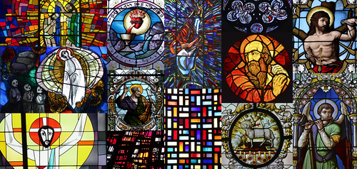 Glasgemälde im Chor links Maria von der Verkündigung, mitte Gnadenstühl, rechts Engel von der Verkündigung